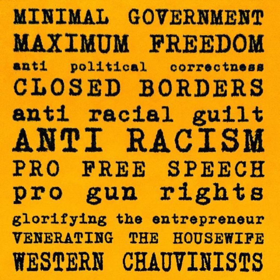We are proud Western Chauvinist who refuse to apologize for creating the modern world. We believe in reinstating the spirit of western chauvinism, minimal government, pro-free speech, maximum freedom, pro-gun rights, closed borders, glorifying the entrepreneur, venerating the housewife, anti-drug war, anti-political correctness , anti-racial guilt, anti-racism.